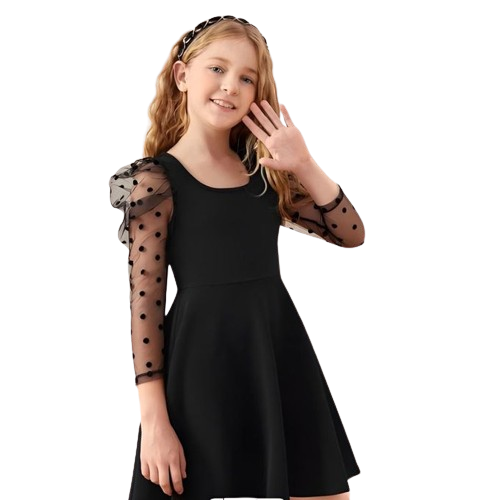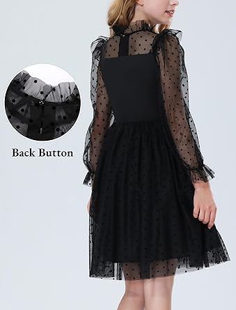 Sheer, long sleeves frame a darted bodice with a mock neck neckline. The girls party dress has a flared silhouette and finishes above knees. Back button closure.