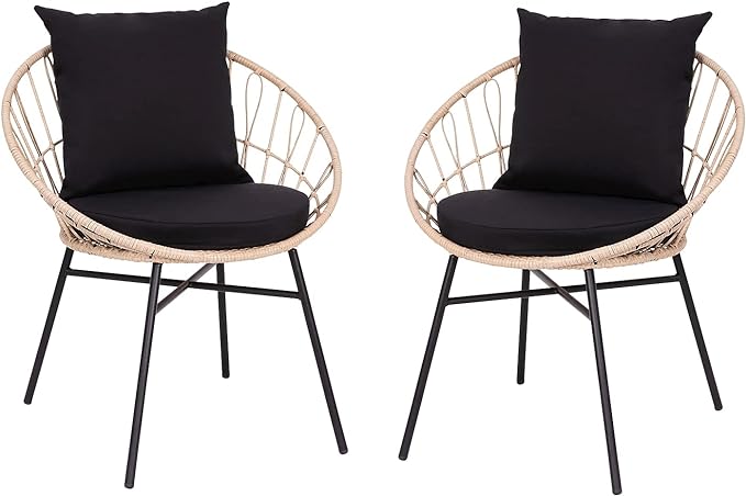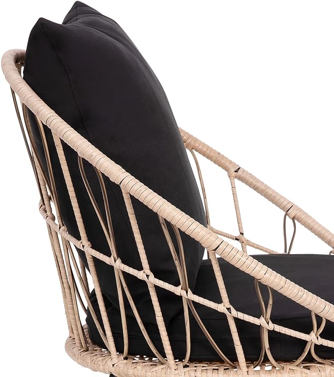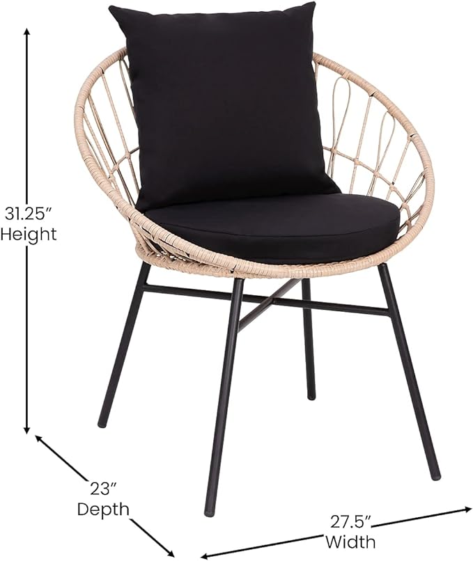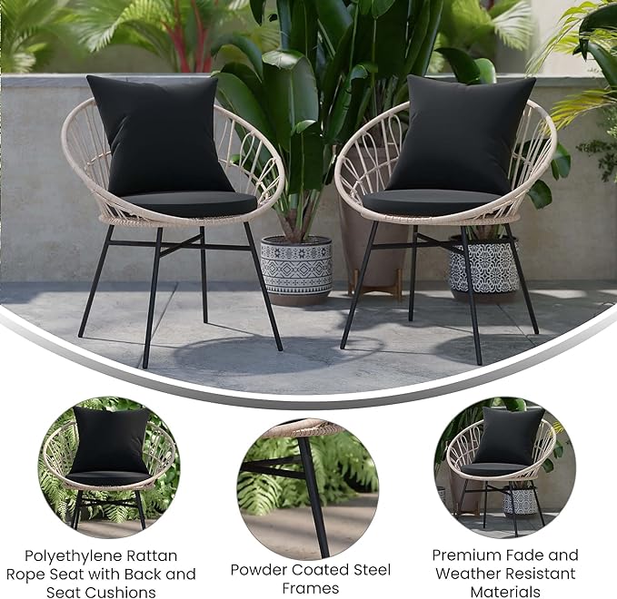 Flash Furniture Devon Set of 2 Modern Boho Rattan Rope Chairs, Weather-Resistant Tan Finish Rattan with Black Back and Seat Cushions - Indoor/Outdoor