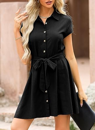 Designed with turn-down collar, button-down front, and short sleeves, the empire waist with belt adds a touch of charm to this solid color dress. A wardrobe essential.